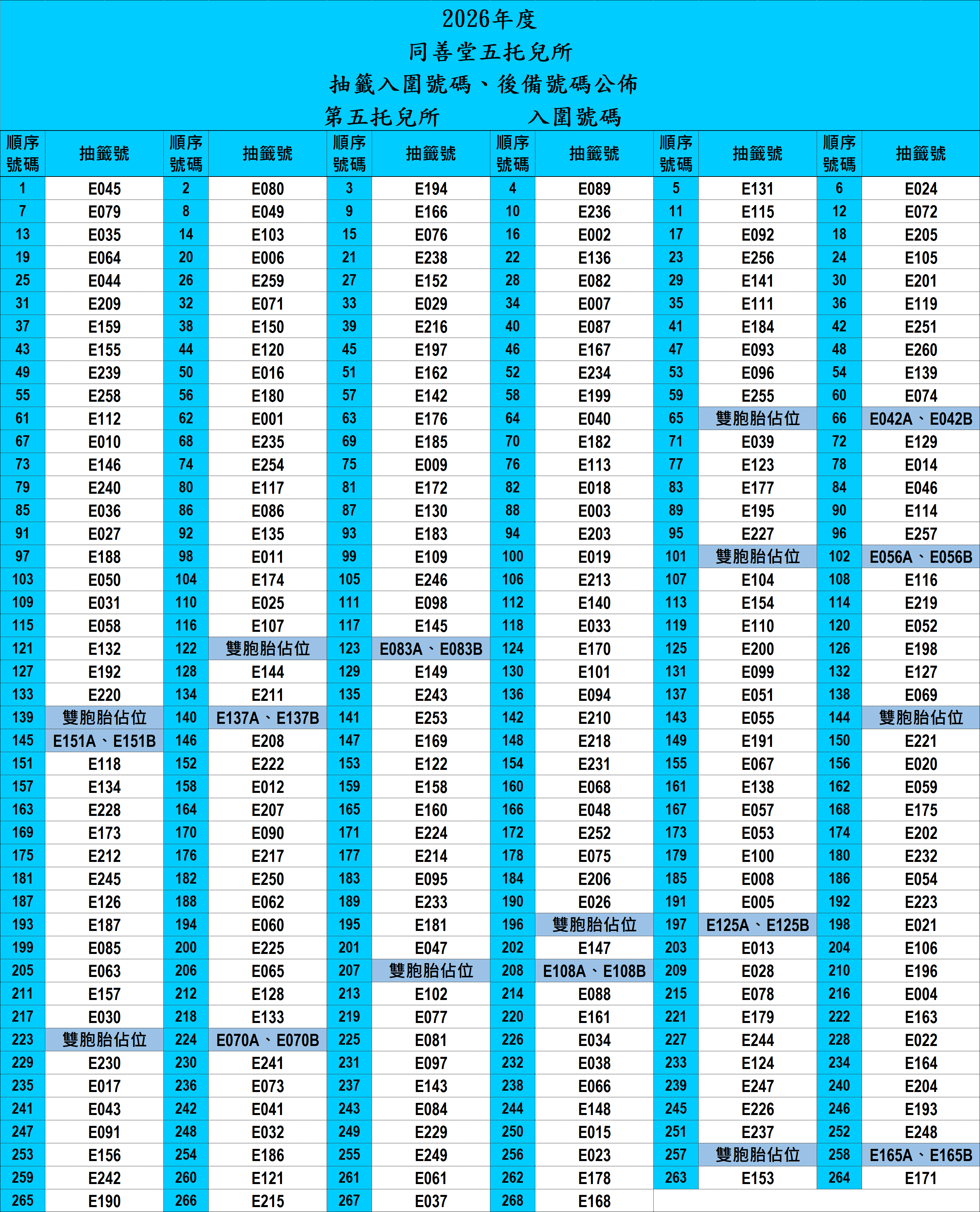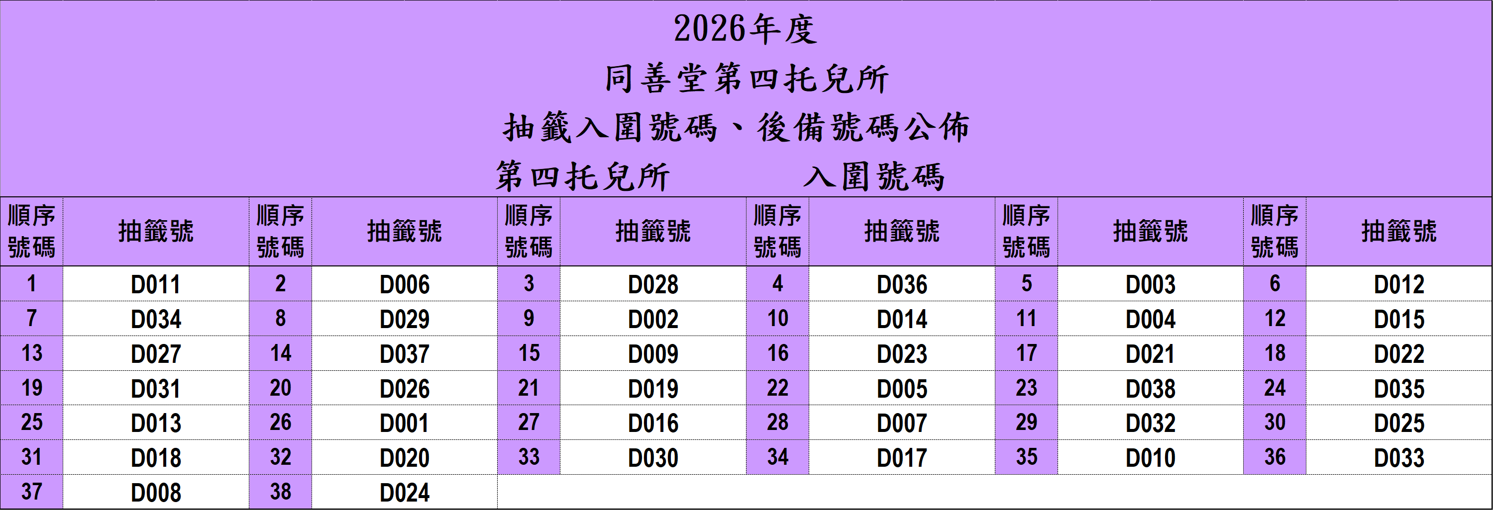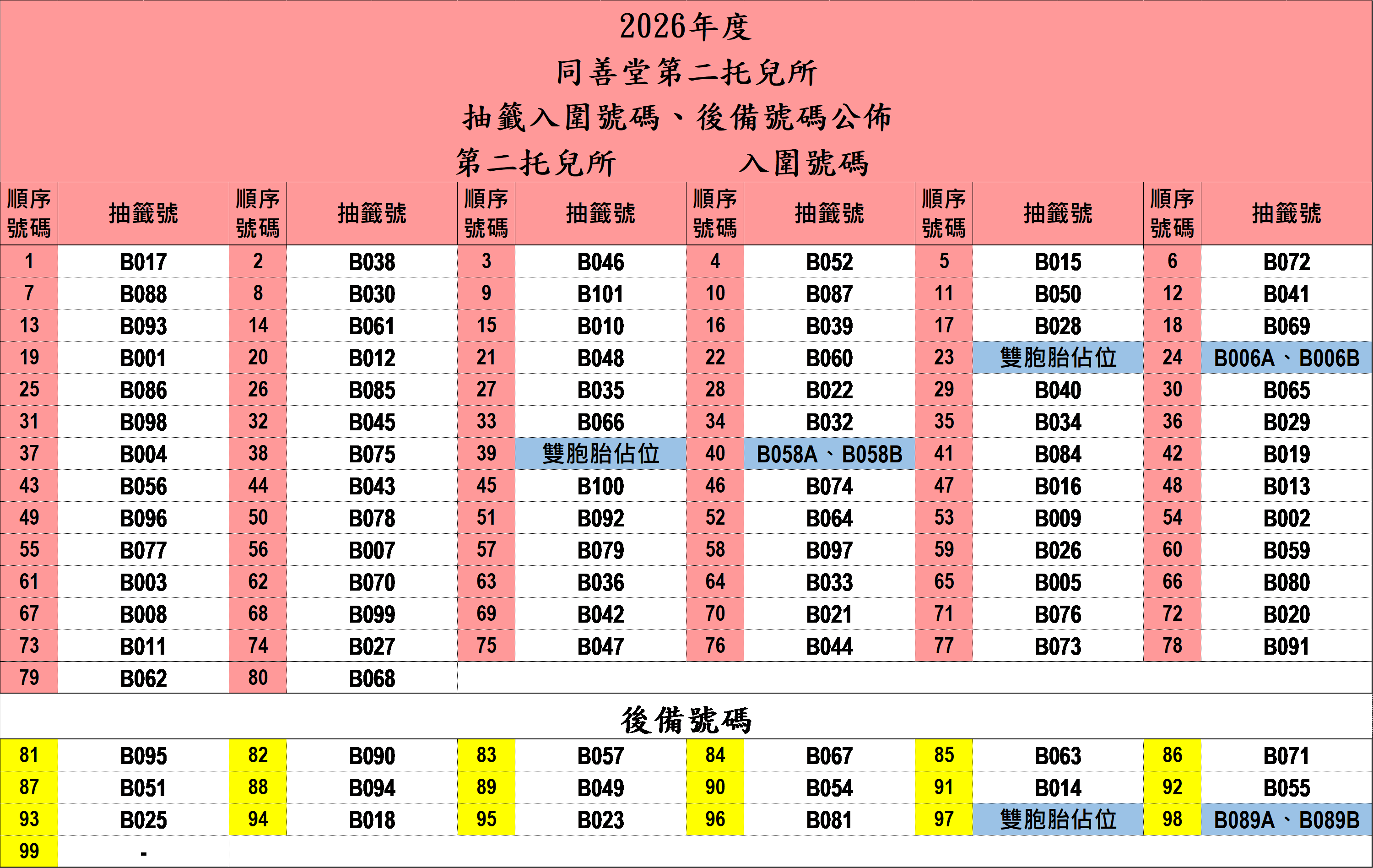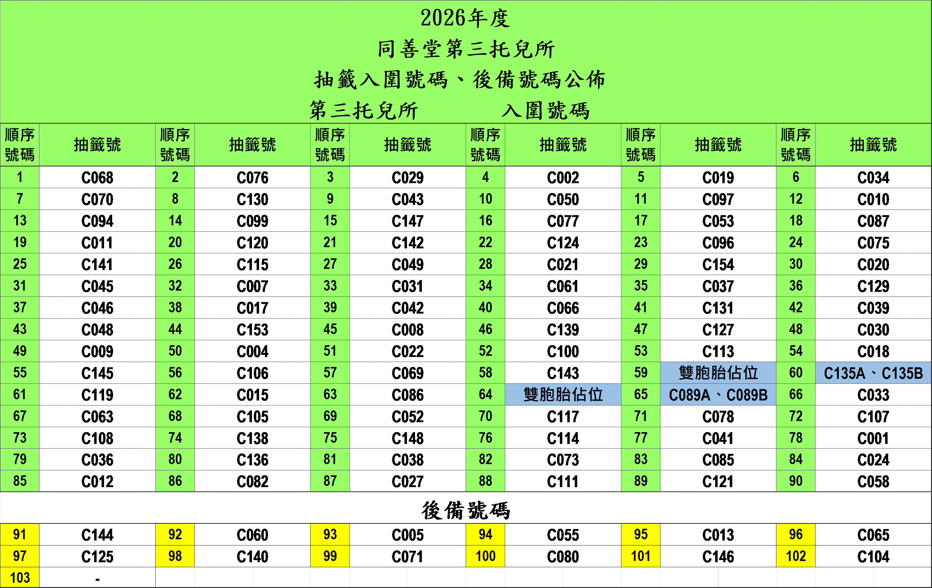 (入圍號碼以第一、二、三、四、五托兒所存案為準)